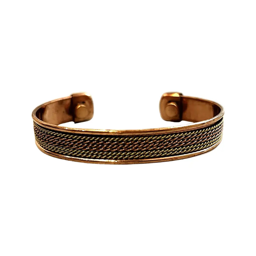 Koppararmband tillverkade av 99% ren koppar, med utvalda designer som innehåller mässing och aluminiumdetaljer. Justerbara och hållbara, de är ett starkt tillskott för hälsobutiker, presentåterförsäljare och smyckeshandlare som letar efter stiliga delar associerade med traditionella välbefinnandepraktiker.