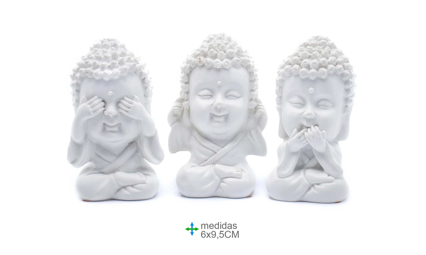 Vackert set med tre Buddhafigurer som symboliserar visdomen "se inget ont, hör inget ont, säg inget ont". Figurerna är tillverkade i porslin och passar fint som harmonisk dekoration i hemmet, på altaret eller i ett meditationsrum.