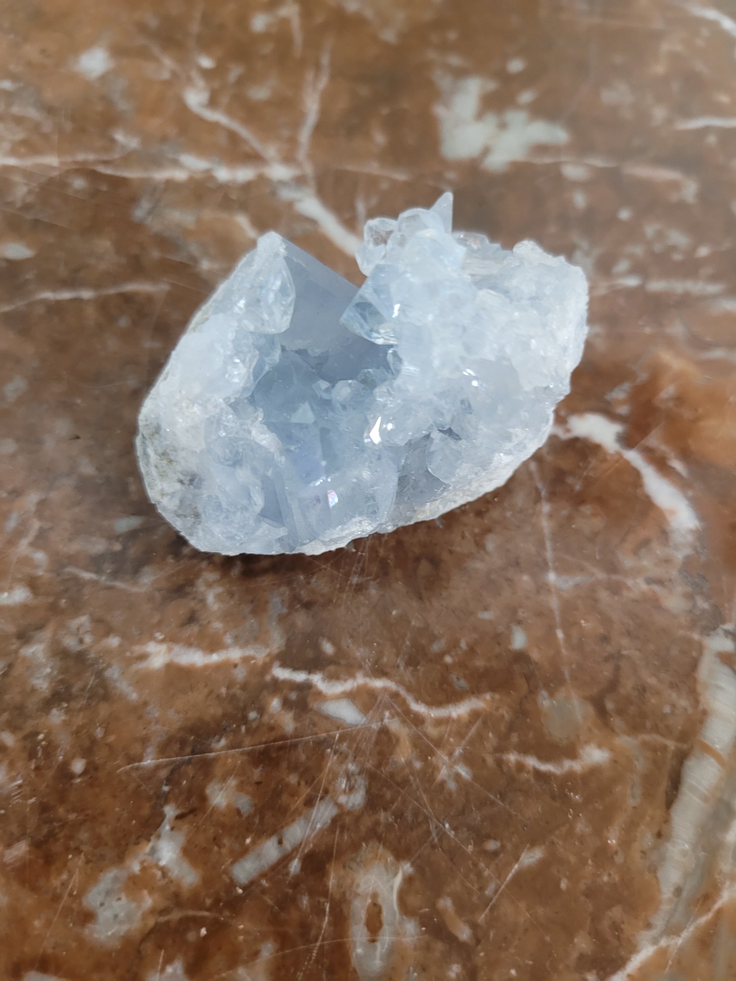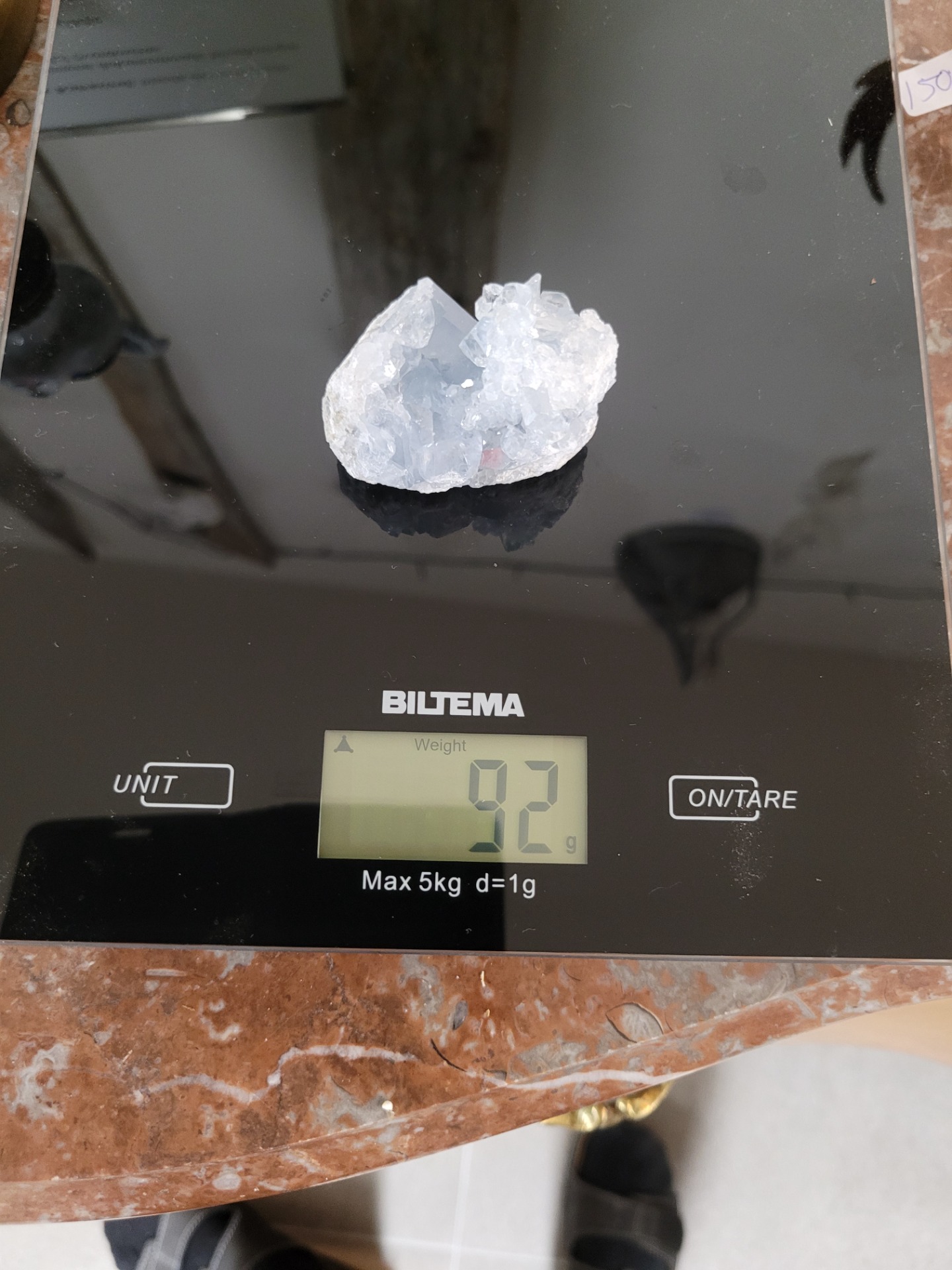 Vackert mellanstort celestinkluster på cirka 90 gram med klar blå ton, tydliga kristaller och naturlig lyster. Klustret har en stabil form och utstrålar en lugn, harmonisk energi som passar perfekt för meditation, energiarbete eller som en rogivande inredningsdetalj.