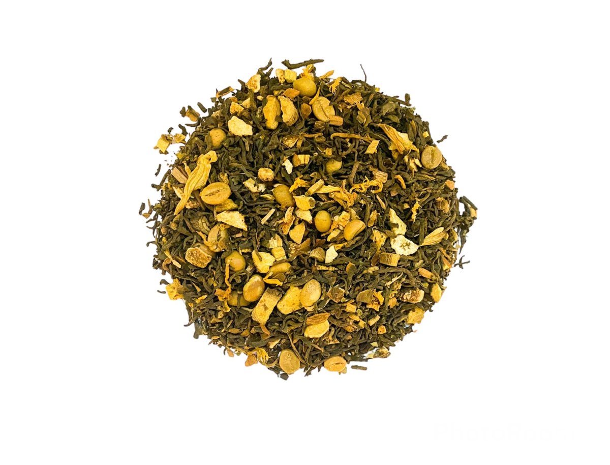 Ingredienser: Pu Erh te (51 %), gröna kaffebönor (22%) citronskal, lakritsrot, grönmynta, kanelbitar, limeolja, solrosblommor, pepparmyntsolja.