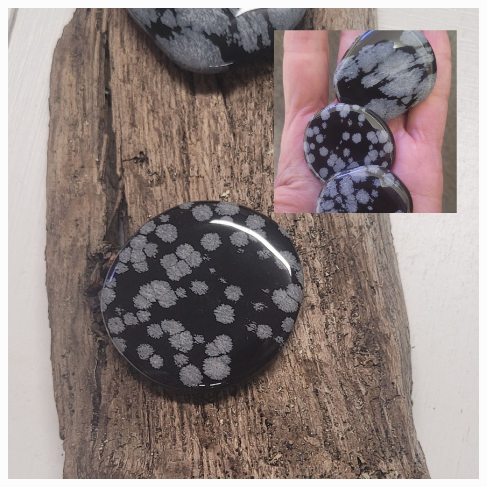 Snöflingeobsidian sägs skapa balans i kropp och sinne samt ge grundning och inre lugn. Den kopplas till baschakrat och anses hjälpa till att bryta negativa mönster, ge klarhet och vägledning vid kaos eller vilsenhet.